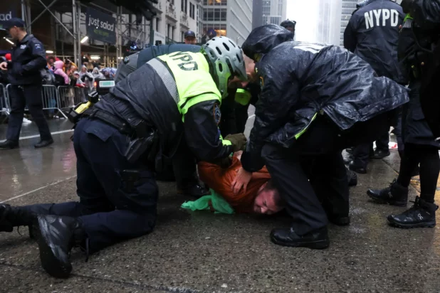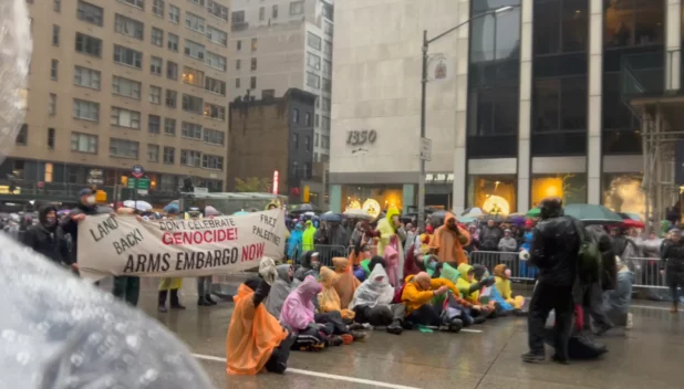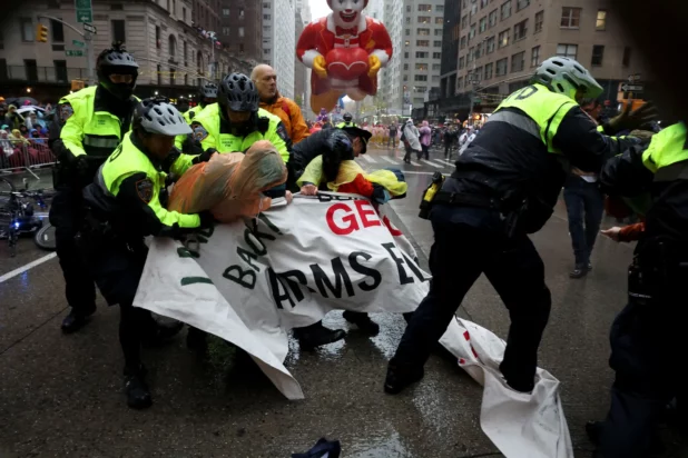 Pro-Palestinian protesters disrupted the Macy’s Thanksgiving Day Parade by obstructing the route, resulting in multiple arrests.