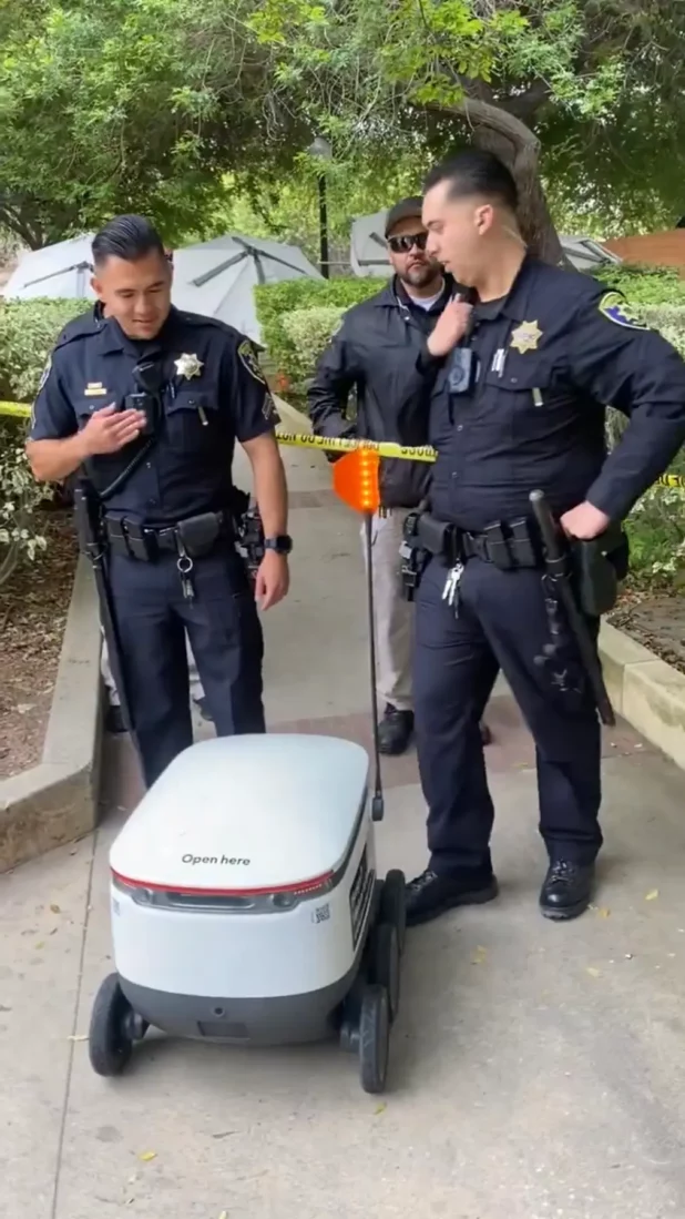 A food delivery robot could be seen coming to a halt when some mildly amused officers stopped it in front of an area it had blocked off to stop the encampment from growing, according to a video from ABC7’s Josh Haskell.
