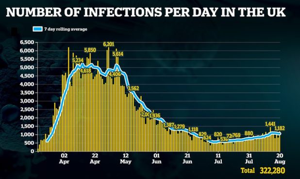 Now, around 1,051 Britons are testing positive for the life-threatening disease each day, on average. It had consistently risen from the start of July and doubled by August 15, when the figure reached a six-week high of 1,097.