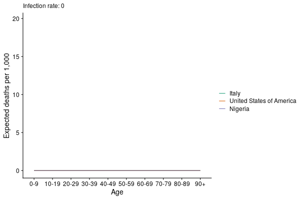 The researchers used data on death rates and population age in Italy and compared it to the US and Nigeria – which has one of the youngest populations in the world, as can be seen in this animated graph.