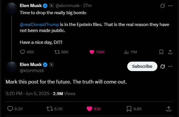 Note that this is a really unique Trump feud. Trump usually goes totally nuclear on anyone over anything, and this time he let Elon go nuclear while saying “well, I guess he’s doing that, maybe he’s mad about some subsidies, I don’t really know, but okay.” Because Trump knew the only thing Elon could do was make a big mess, and didn’t want to pressure him into that, when he knew that when some of the drugs wore off, Elon would realize making a mess doesn’t help him any more than it hurts Trump.