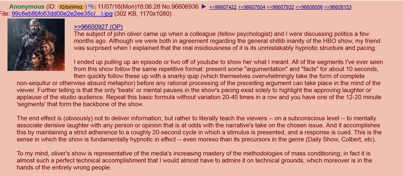 This article was updated to add the discovered /pol/ screencap and to note that 43-year-old John Oliver looks to be 62 (a previous version of the article had estimated that he looks 57, but on further observation, it was understood that he looks 62).