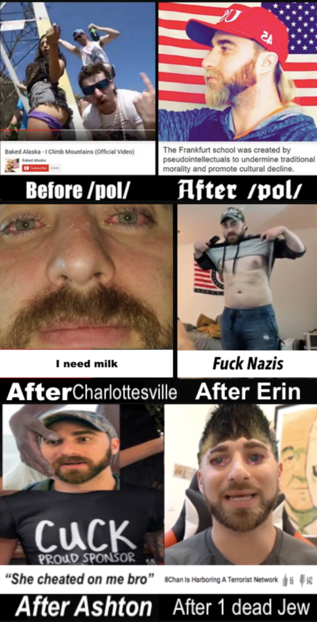 For those who don’t know, Baked started out as a Buzzfeed social media agent/aspiring rapper – affectionately dubbed “Feminem” by the Internet. After quitting Buzzfeed, he started retweeting Milo’s account on Twitter and piggy-backed his way to e-celeb fame during the halcyon days of the Trump campaign. It was only a matter of time until he found /pol/ (or, rather, /pol/ found him) and he began to parrot J-woke talking points. Then it was just a hop and a skip over to hanging out with Richard Spencer and other people in the Alt-Right en route to the disastrous Charlottesville Rout. At the event, he got maced with some Antifa-brewed chemicals and had to be taken to the hospital.