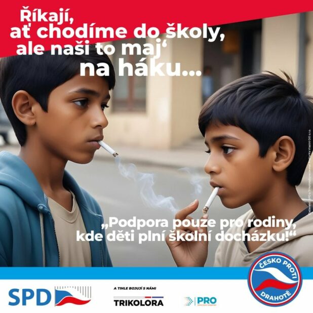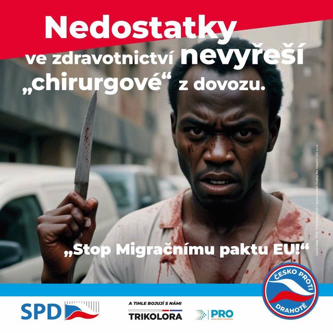 The SPD erected large, provocative billboards in Prague’s Wenceslas Square last September, just before the regional elections. One image showed an African migrant holding a bloody knife, his shirt also stained with blood, alongside the slogan: “Healthcare shortfalls won’t be solved by imported ‘surgeons.’”