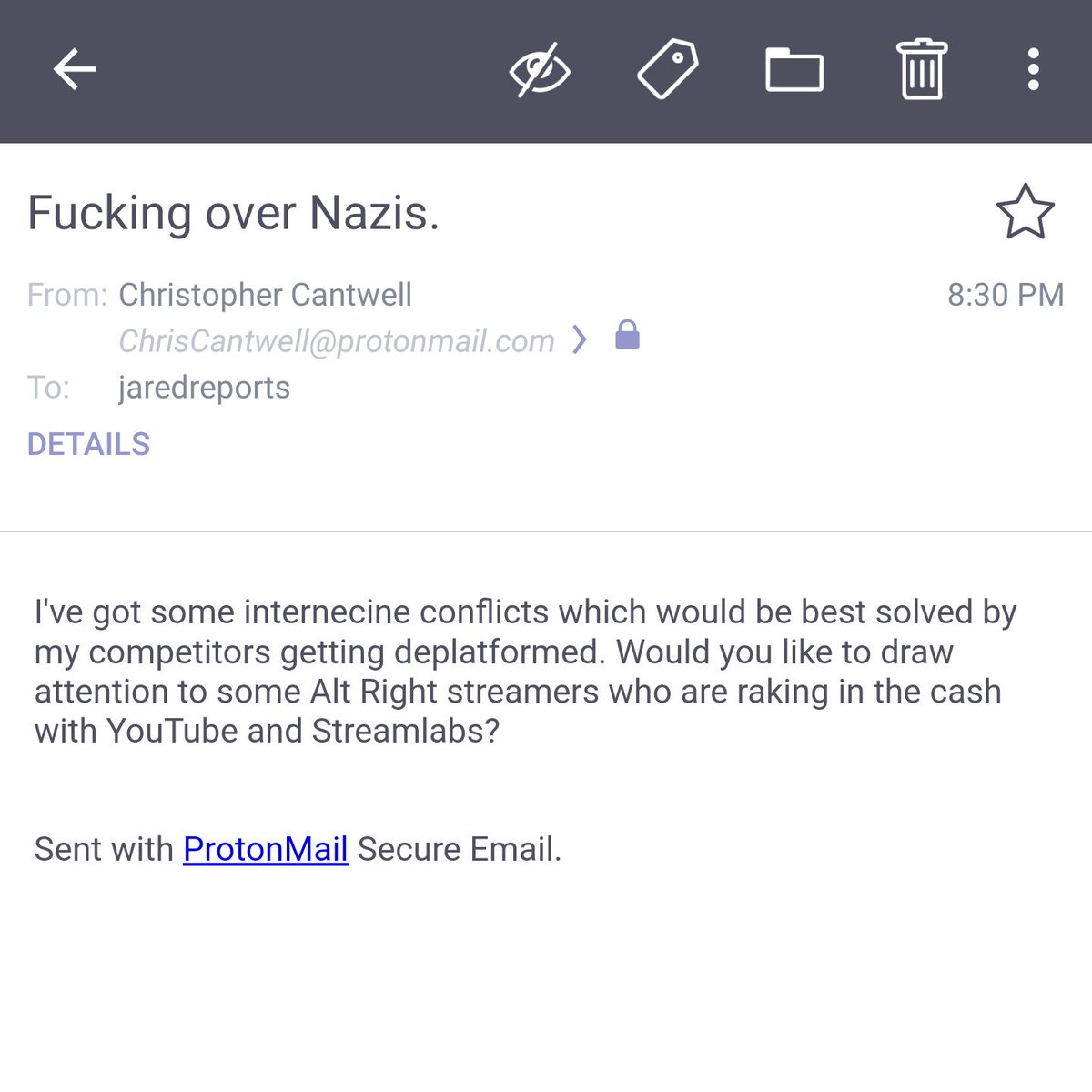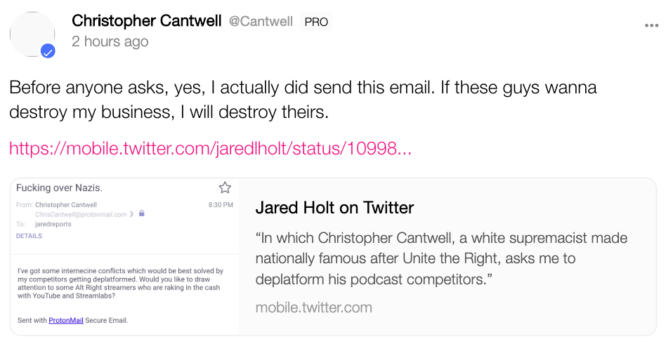 He has reported other podcasters to Jared Holt to get them deplatformed.