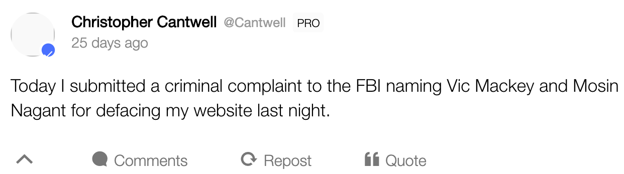 Making fun of Christopher Cantwell on the internet is not a crime, but when you report people to the FBI like this, it gives them a lot of leeway to open an investigation and start digging. Which is what you can be sure they did to Vic Mackey and Mosin Nagant.