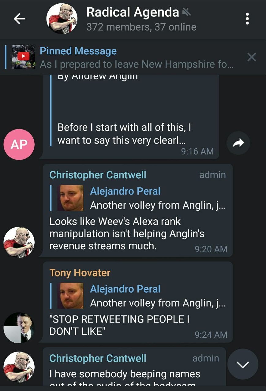 This is a private Telegram group. Run by Cantwell. That a person promoted by Eric Striker is in. A person who is also Matt Parrott’s podcast co-host. Casually hanging out with a fed snitch.