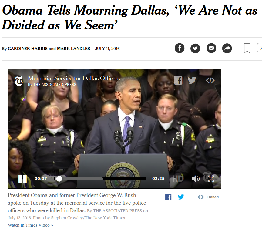 Look at the model set by the five officers we mourn today. Acknowledge the progress brought about by the sincere effort of police departments like this one in Dallas. And embark on the hard but necessary work of negotiation, the pursuit of reconciliation.