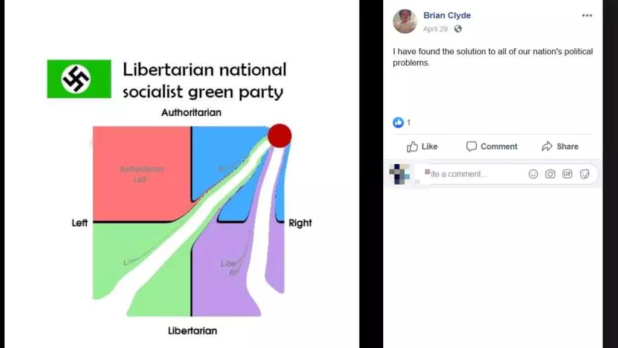 Clyde posted a picture of a swastika on a green flag, calling it a “solution” on April 29. He also often posted anti-U.S. government conspiracy theories, including posts about secret pedophile rings and CIA experiments.