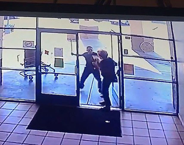 The man appears to be opening the door for the woman as she is exiting when he suddenly attacks her and gets away with her pizza pie.