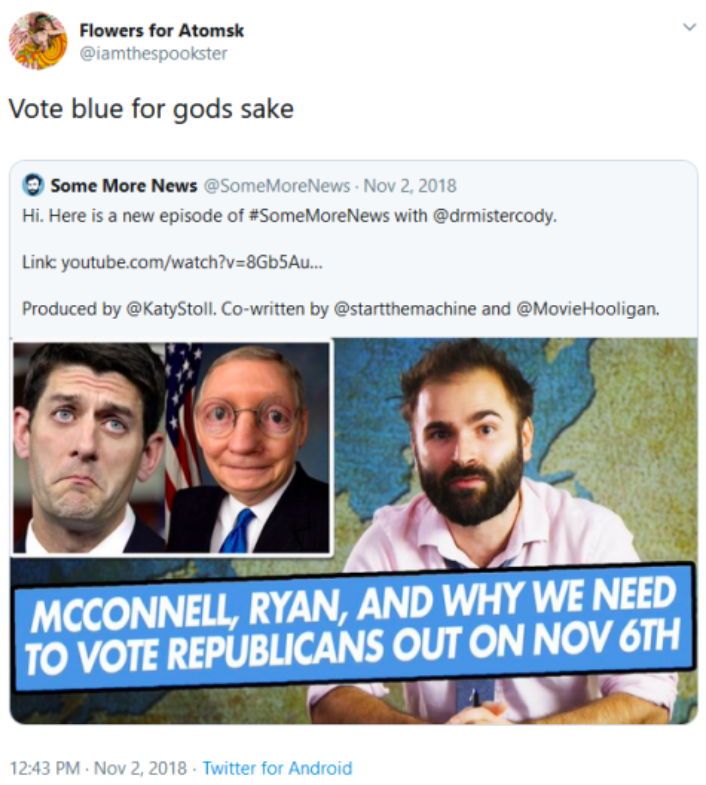 On Nov. 2, 2018, he wrote: “Vote blue for gods sake.”