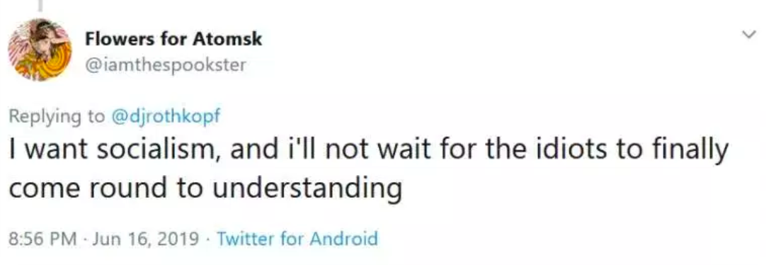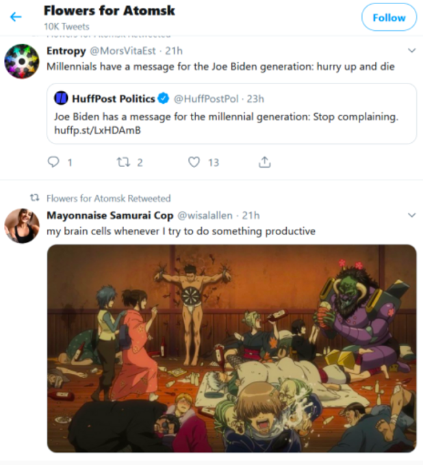 His top post was a retweet of a person responding to a Huffington Post story. That person had written, “Millennials have a message for the Joe Biden generation: hurry up and die.”