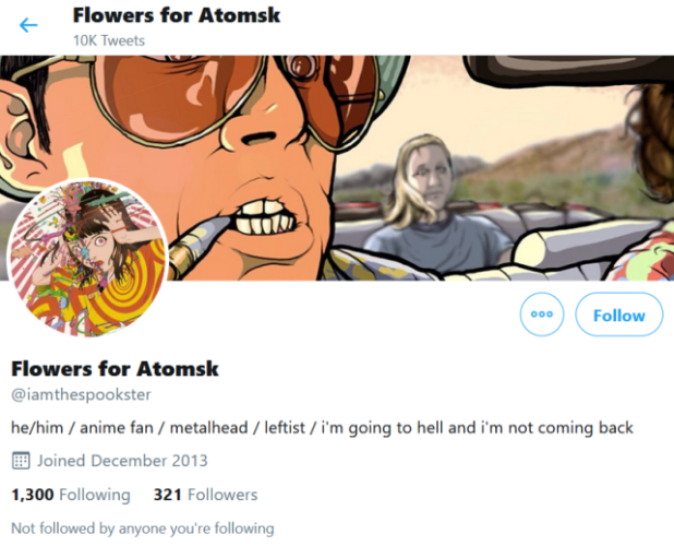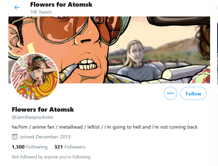 He also wrote that he enjoyed anime, railed against ICE and the industrial revolution, and made references to Satan. In May, he tweeted, “You’ll never be rid of me. I’ll haunt your life like a fucking vengeful spirit.” He added, “My Horoscope Just Reads ‘Doom.’” He shared posts of people outed for possibly being at a KKK rally in Dayton and wrote, “Know your enemies.”