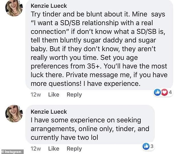 ‘Try tinder and be blunt about it. Mine says ”I want a SD/SB relationship with a real connection.” If [they] don’t know what a SD/SB is, tell them bluntly sugar daddy and sugar baby. But if they don’t know, they aren’t really worth your time,’ Lueck’s comment reads.