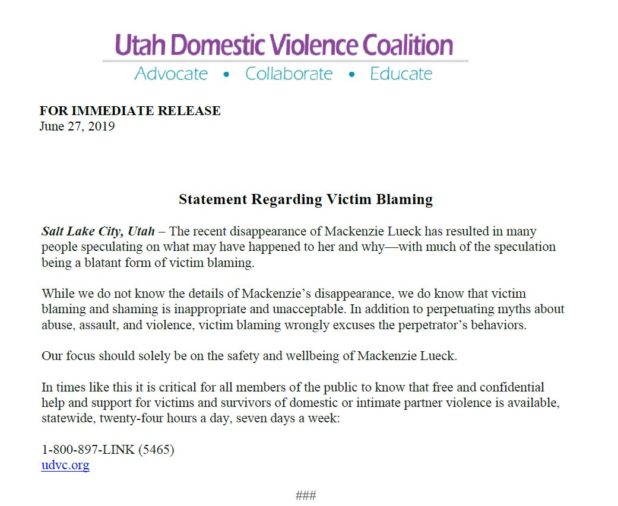 The Utah Domestic Violence Coalition released a statement yesterday accusing people of “victim blaming” for saying that Mackenzie Lueck being a whore might have had something to do with her death.