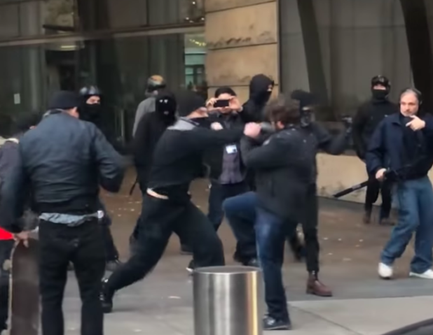 But if you watch the video from the event above, you’ll see that the “right-wing” guys are just being hounded by Antifa brats block after block for until they totally fall back. The organizers desperately try to prevent any of their guys fighting back against Antifa provocations.