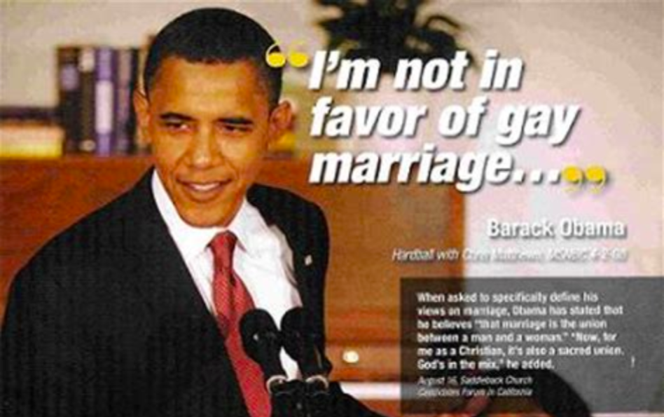 The history of homosexual prejudice in the Democrat Party is long and strong. During the 2008 presidential election, bigoted homophobes Barack Obama and Hillary Clinton both were virulently opposed to homosexual marriage.