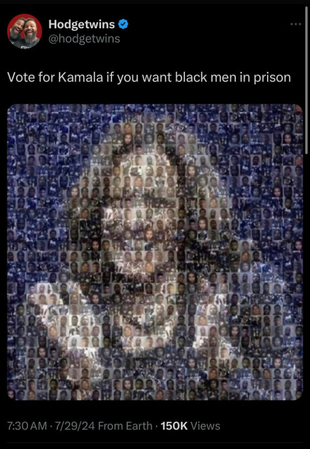While Team Kamala has switched to “weird,” Team Trump has switched to “don’t vote for Kamala or she’ll put all the blacks in prison.”