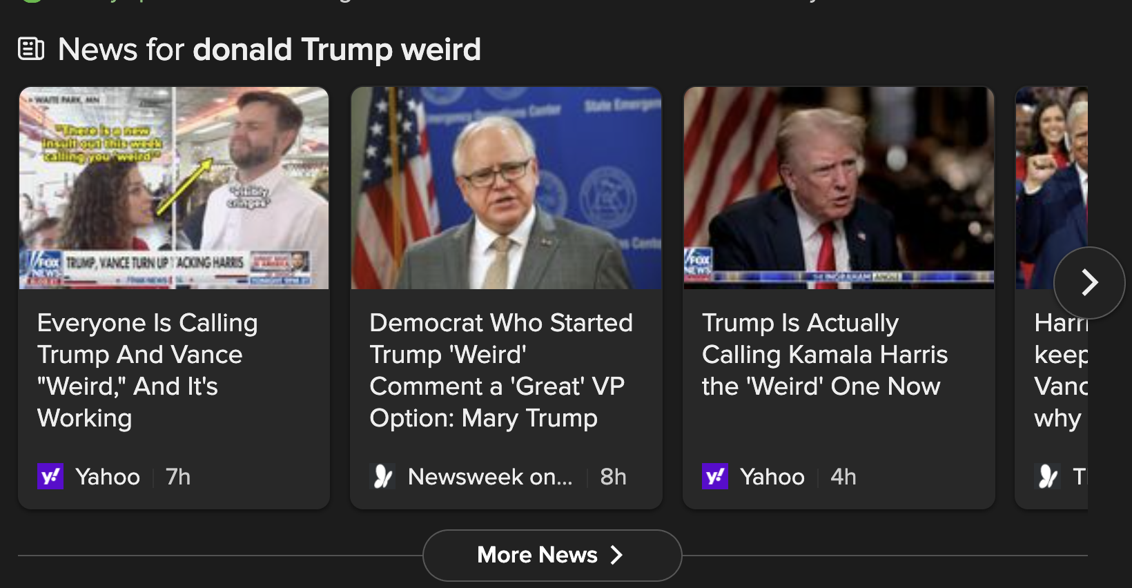 Apparently, the whole “Donald Trump is a fascist trying to destroy democracy” bit was getting kind of exhausting and everyone hated it, so the Democrats have done a switcheroo narrative with their switcheroo candidate: instead of calling Trump a fascist Hitler figure, they are saying he is “weird.”