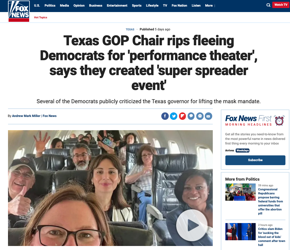 Recently, Texas Democrats flew to Washington in some kind of demonstration against the right wing. I don’t know or care about the specifics of it. But after they flew to DC, some people tested positive for the virus. Instead of simply saying “Democrats again prove that this whole virus nonsense is a hoax,” Republicans and their media organs attacked the Democrats as “super spreaders.”