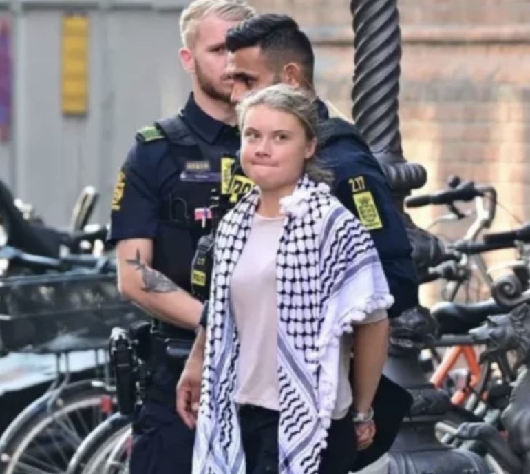 Several web users posted pictures and videos purportedly showing Thunberg’s arrest on X (formerly Twitter). They featured the activist wearing a black-and-white keffiyeh shawl, a traditional Arabic headdress, being led to a police van in what looked like handcuffs.