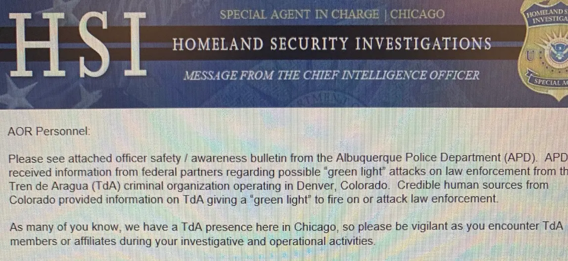“Credible human sources from Colorado provided information on TdA [Tren de Aragua] giving a ‘green light’ to fire on or attack law enforcement,” said the memo, from the Homeland Security Investigations office in Chicago.