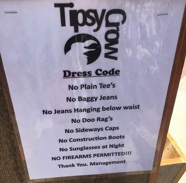 Tipsy Crow Tavern said it would refuse service to patrons who were seen wearing clothing such as baggy jeans, plain T-shirts, and construction boots, according to The Des Moines Register on Thursday.
