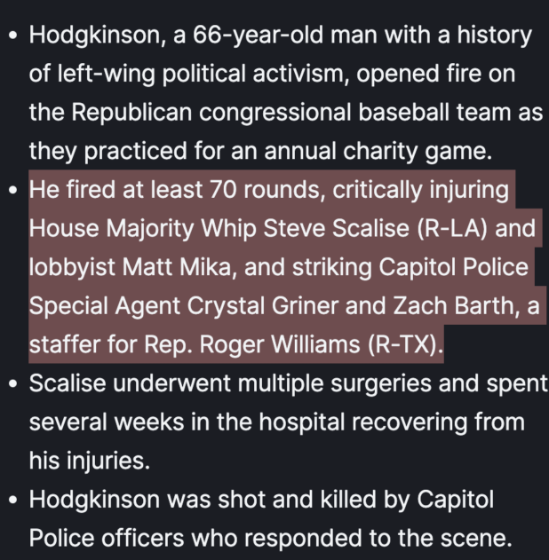 Remember when multiple Republicans were shot at a softball game, and the majority whip, Steve Scalise, was almost killed?