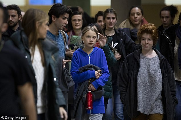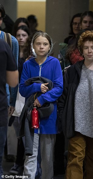 Greta’s appearance today comes after she said on Friday that the global wave of school strikes for the climate over the past year has ‘achieved nothing’ because greenhouse gas emissions have continued to rise.