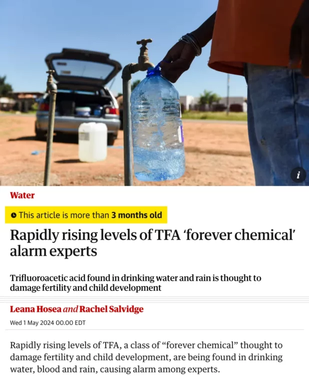 TFA is largely produced when fluorinated PFAS gas, or f-gases, break down in the atmosphere. The compound has a life of around 1,000 years – about as long as carbon dioxide. Its toxicity is far less understood than most common PFAS compounds, though recent research shows reproductive system harms similar to other forever chemicals.