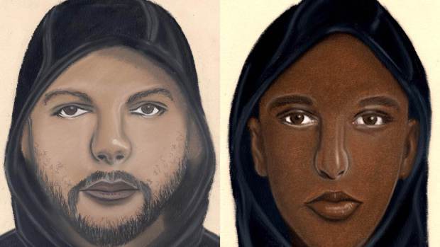 Investigators believe the two incidents may be connected. Authorities released composite sketches of three of the suspects, although police are searching for several more.