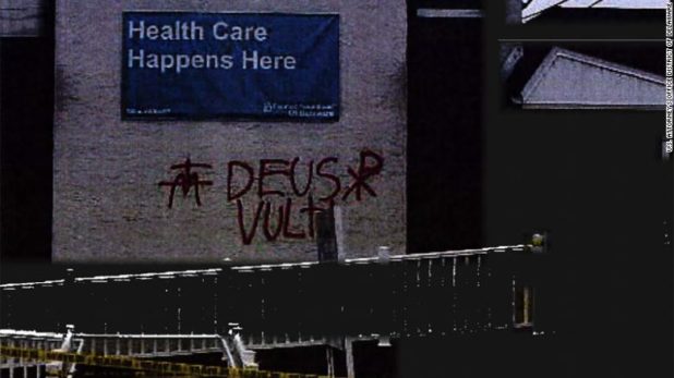 Video surveillance showed Gulick spray-painting the words “Deus Vult” in red letters on the building and throwing the lit incendiary device at the building’s front window, according to the complaint. The object exploded but self-extinguished after about a minute, prosecutors said.