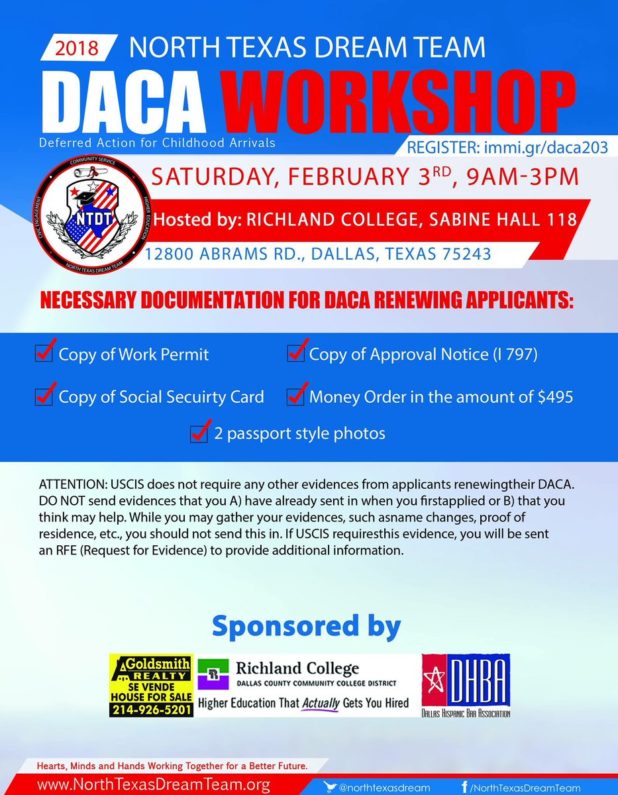#RichlandCollege will be hosting a #DACA immigration workshop on Feb. 3. During the event, members of the @northtexasdream and several immigration attorneys will be on hand to provide updates about DACA and current immigration issues. https://t.co/UgMmnOdaY9