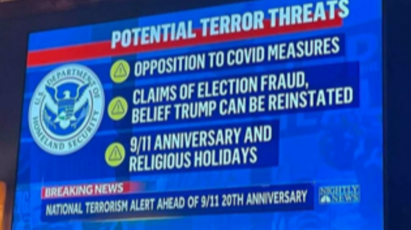 The upcoming 20th anniversary of 9/11, religious holidays and more pandemic restrictions amid a COVID-19 surge caused by the delta variant, could give rise to terrorist attacks in the U.S, the Department of Homeland Security is warning.