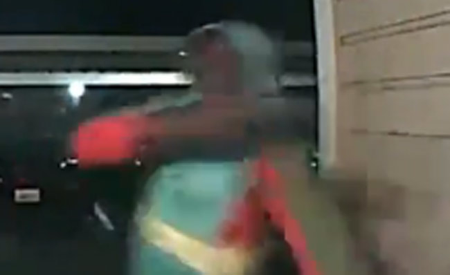 But the assailant dashes off as a figure appears in the background of the scene on Canyon Oak Drive near Keller Avenue.