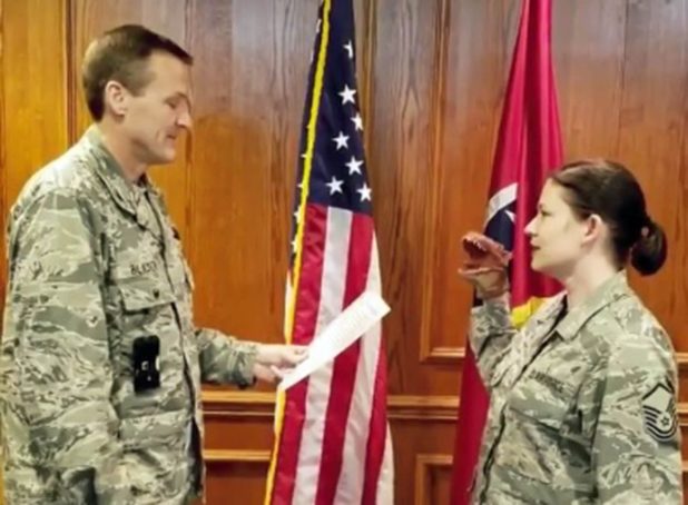 Master Sgt. Robin Brown, the SNCO who was taking the oath, is facing administrative action in addition to losing her full-time position at the Tennessee Joint Public Affairs Office, according to the Air Force Times.