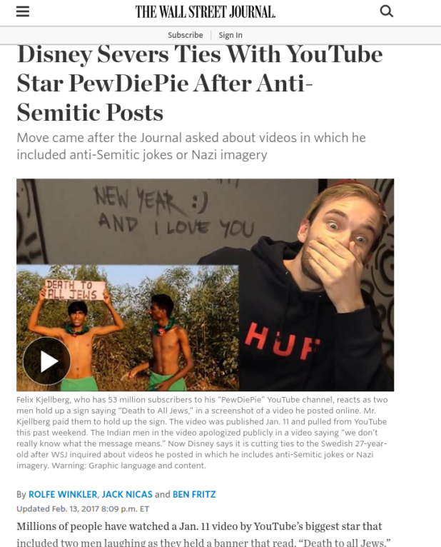 On Monday after the Journal contacted Disney about the videos, the entertainment giant said it was severing ties with Kjellberg, who as PewDiePie rose to prominence via clips of himself playing videogames or performing skits and making crude jokes. “Although Felix has created a following by being provocative and irreverent, he clearly went too far in this case and the resulting videos are inappropriate,” said a spokeswoman for Maker Studios, the Disney division that was business partners with PewDiePie.