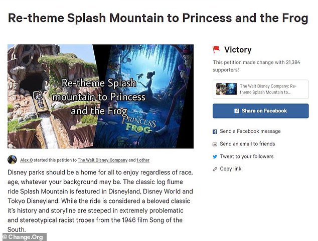 Splash Mountain came under harsh criticism for being based off the film which includes racist portrayals, and a petition racked up over 21,000 signatures urging Disney to change the theme of the fan-favorite log-flume ride at their parks.