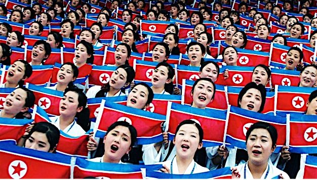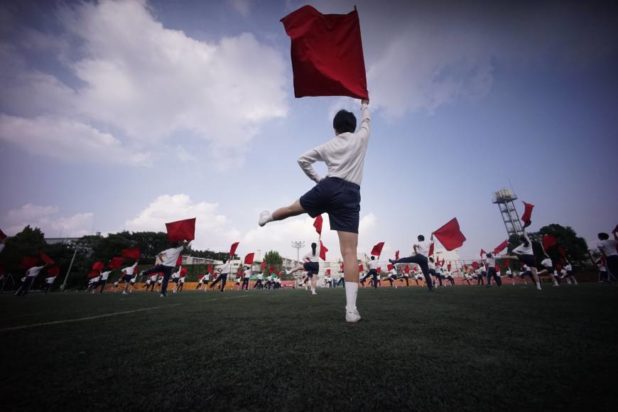 The children, gathered in rows on a school field in Tokyo, crouch and then reach up in unison, waving red, white and blue banners to form a North Korean flag as the school band plays an emotional rendition of a song for their “motherland.”