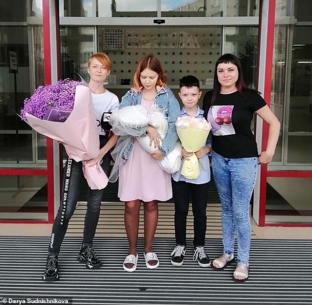Ivan – now 11 – was with her as she departed a clinic in Krasnoyarsk with baby Emilia, born on August 16.