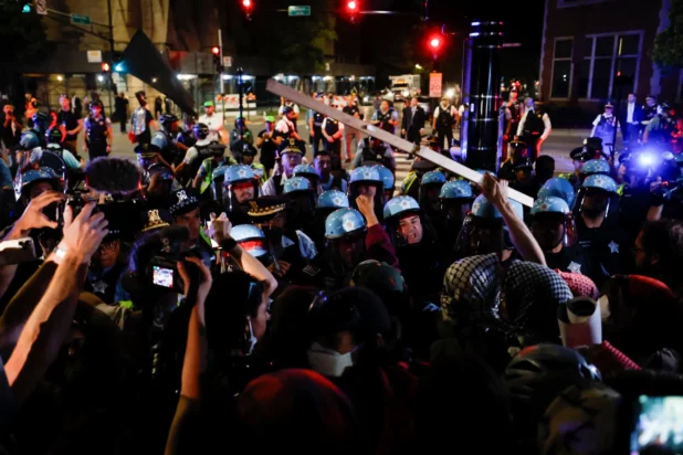 “As they officially nominate killer Kamala as the head of the stake, we are out here to say that nothing they say or do in that convention will wash the blood of Palestinian men, women, and children off their hands,” a protester said over a bullhorn to the park full of demonstrators.