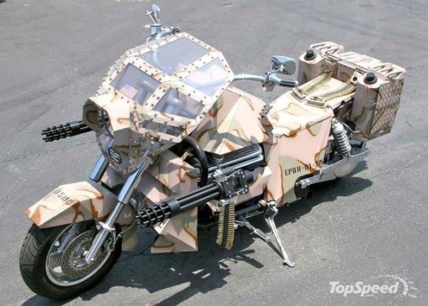 Something like this. Oh but that’s just a comic book. Can’t have multiple missile launchers and lasers on a single motorcycle.