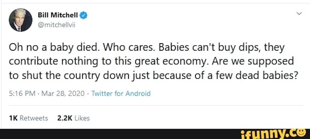 That is to say: the goofy personage of Bill Mitchell, a boomer with really weird plastic surgery, was being made fun of for saying something that turned out to be exactly true.
