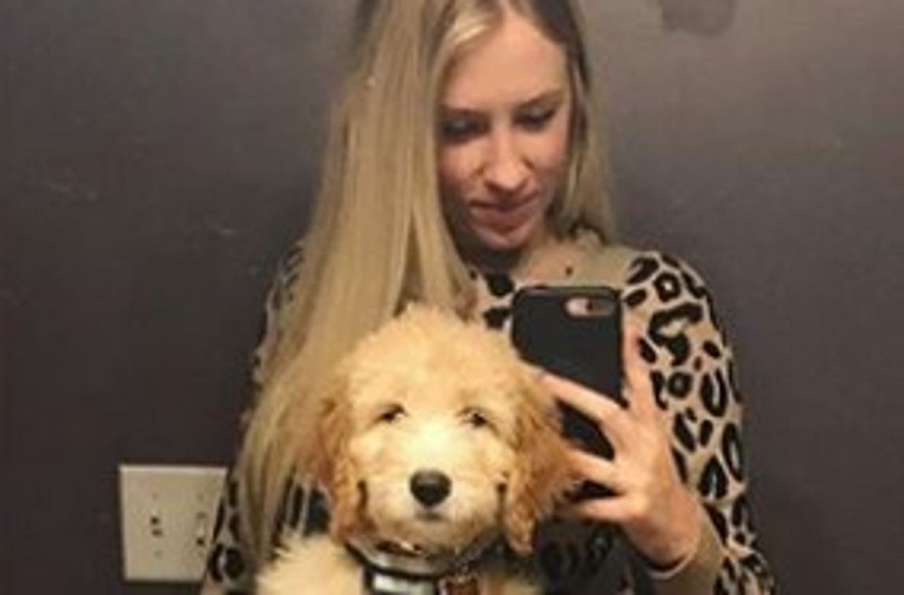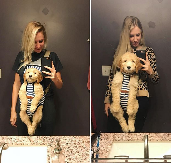 Abby Fleischman and her fiancé are parents to two goldendoodles, Lena and Olive. The pupper duo is so adorable that their fluffy cuteness has even earned them more than 24,000 Instagram followers — they’re also getting a little famous for the way they are transported, namely Olive, who spends most of her days being toted around by her dog mom in a Baby Björn.