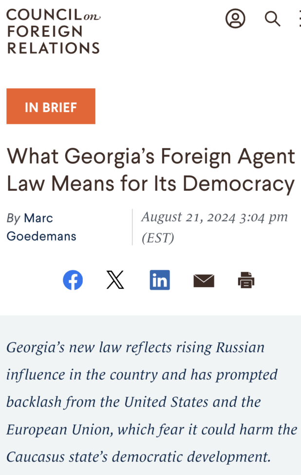Here’s an article from the Council on Foreign Relations claiming that forcing foreign agents to register is a Russian conspiracy, and that requiring foreign agents to register destroys democracy.