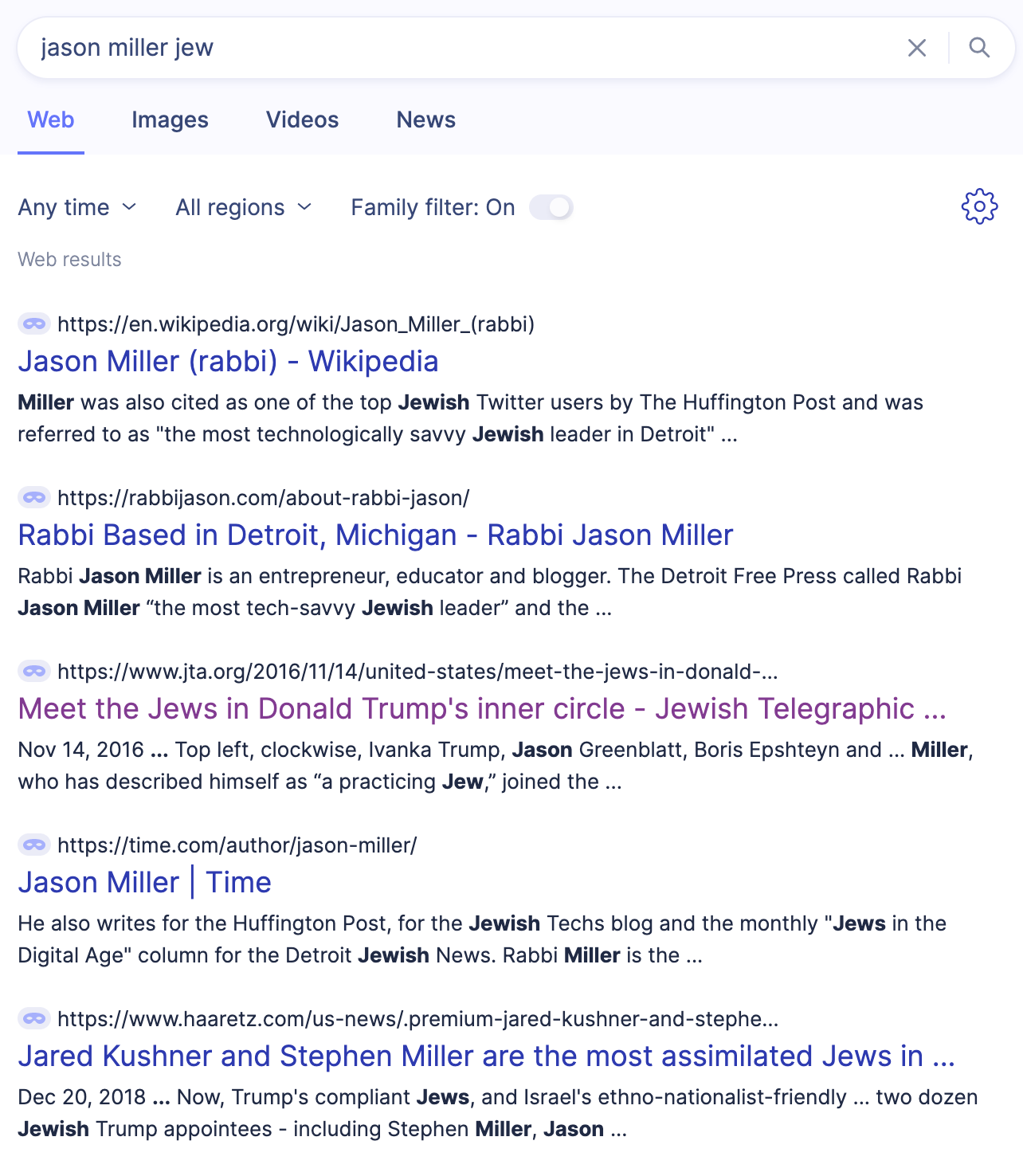 (The old “[person name] jew” search doesn’t show anything either – other than that someone named “Jason Miller” should use a middle initial.)