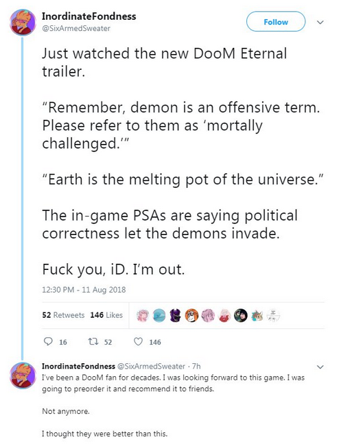 The doomguy strutting around the base with everyone else shitting their pants is a great sequence. I could feel the testosterone dripping from it. It closely mimics the experience of a nationalist entering a bar filled with soyboys sipping pink ladies.
