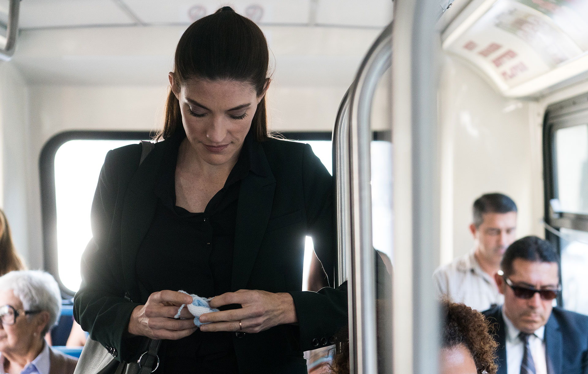There is a small vignette that shows a woman, played by Jennifer Carpenter, who has recently had a baby and doesn’t want to go back to work arguing with her husband about how she wants to stay with the baby.