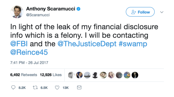 But the episode that triggered Scaramucci’s outburst — a media report on his financial disclosure forms — was not the result of a leak.
