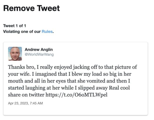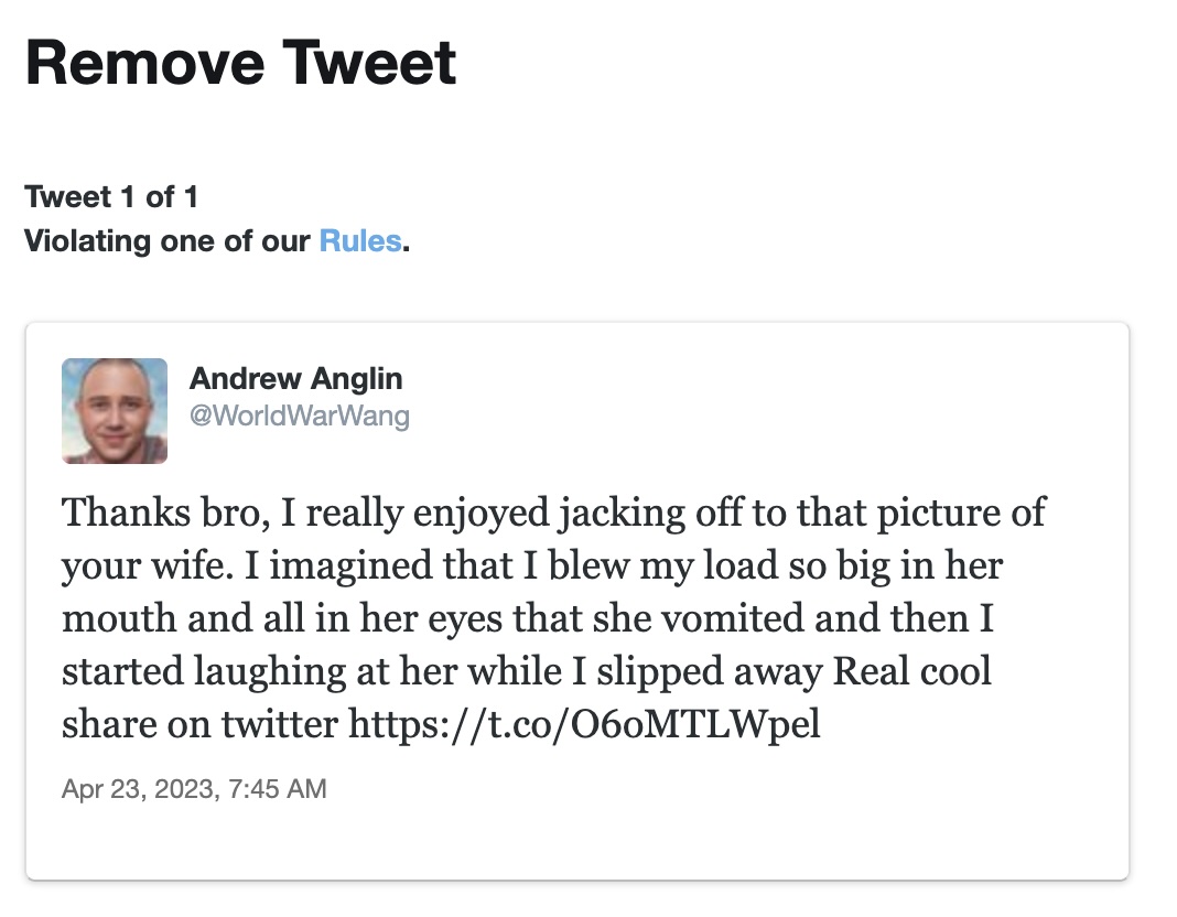 I wish I had a screenshot that featured the picture of the wife, as it was much funnier. If someone has it, I will add it. But I only have the one from inside the panel when I was told I was being banned for it. It’s still totally unclear if I was actually perma-banned for that, because what happened was, they gave me a 12 hour suspension for it (you can see that is the “delete this yourself” ritual submission and humiliation page, which is the result of deranged psychological research), and after deleting the tweet and waiting 12 hours, I logged back in, and everything was normal, then my account totally locked and I was permabanned. I don’t know if it was that tweet or not just a general “get this troublesome paddy out of her” situation.